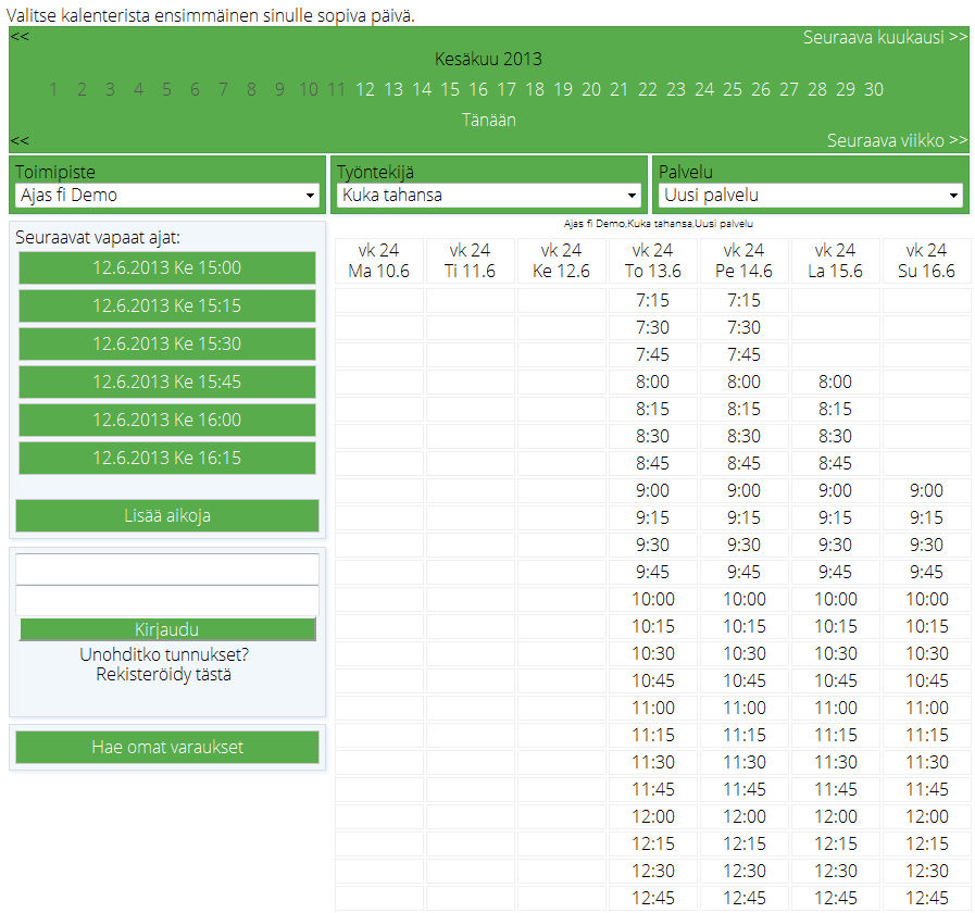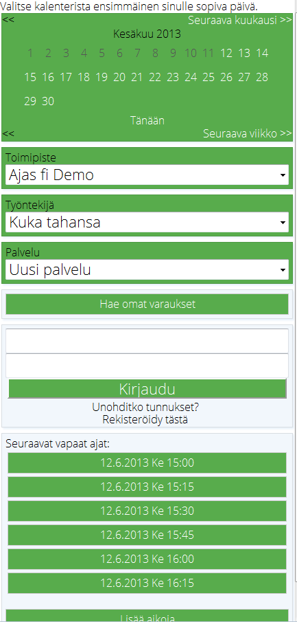 Lisäsimme Internet-ajanvarausjärjestelmän asiakaspuolen teemoihin valittavaksi kaksi uutta vaihtoehtoa: ”Responsiivinen sininen” ja ”Responsiivinen vihreä”