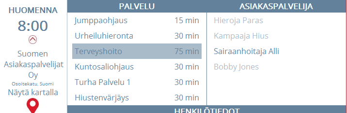 - Esimerkkikuvassa tilanne, jossa toimipiste on valittu, mutta ei palvelua eikä asiakaspalvelijaa.