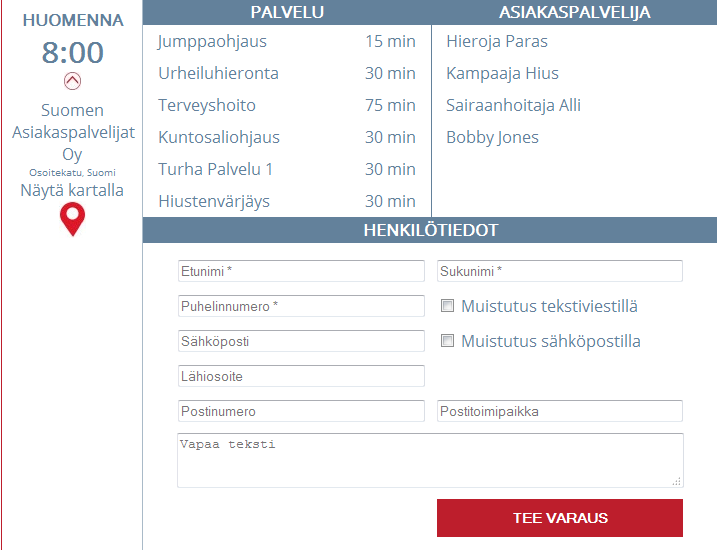 Kun klikataan haluttua aikaa ylläolevalta listalta, tulee näkyville kaikki palvelut ja asiakaspalvelijat, joille voidaan varata.