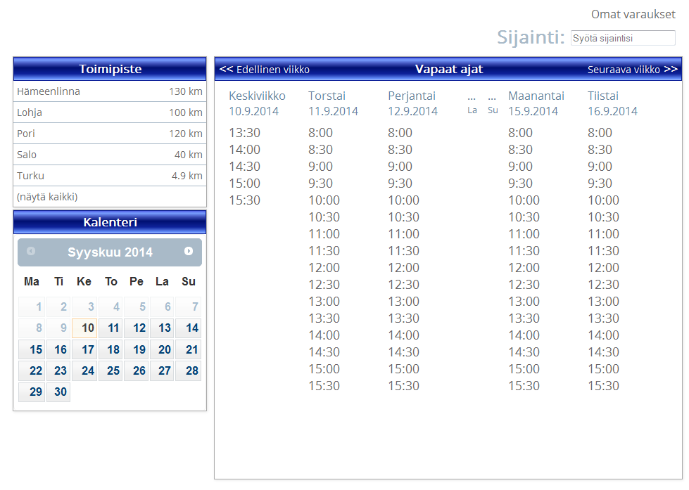 Viikkonäkymä esittää vapaat ajat ja pienentää sellaiset päivät, joihin ei ole yhtään aikoja varattavissa. Järjestelmä osaa esittää myös toimipisteiden etäisyydet omaan sijaintiin nähden.