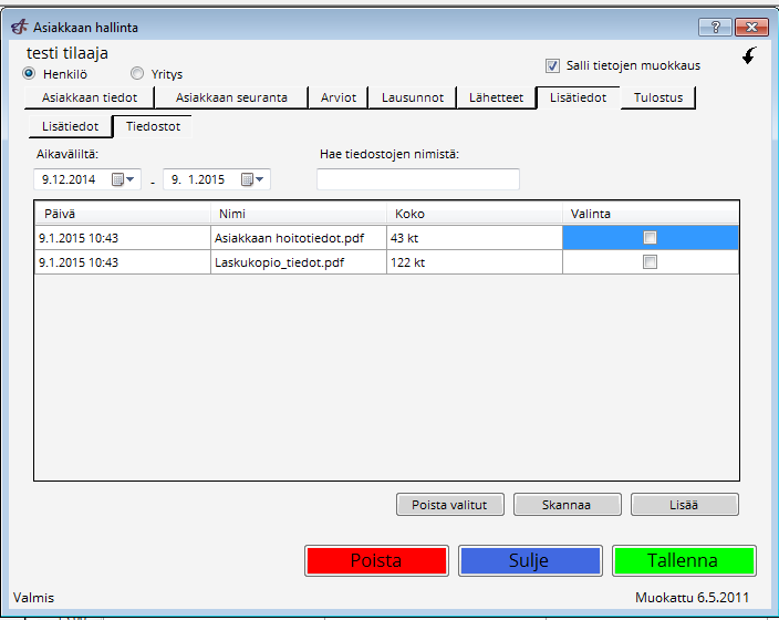 Sen kautta asiakaskortille voidaan tallettaa tiedostoja joko kovalevyltä tai skannerilta. Tiedostot ovat käytettävissä kaikilla koneilla, jotka käyttävät samaa online-tietokantaa.