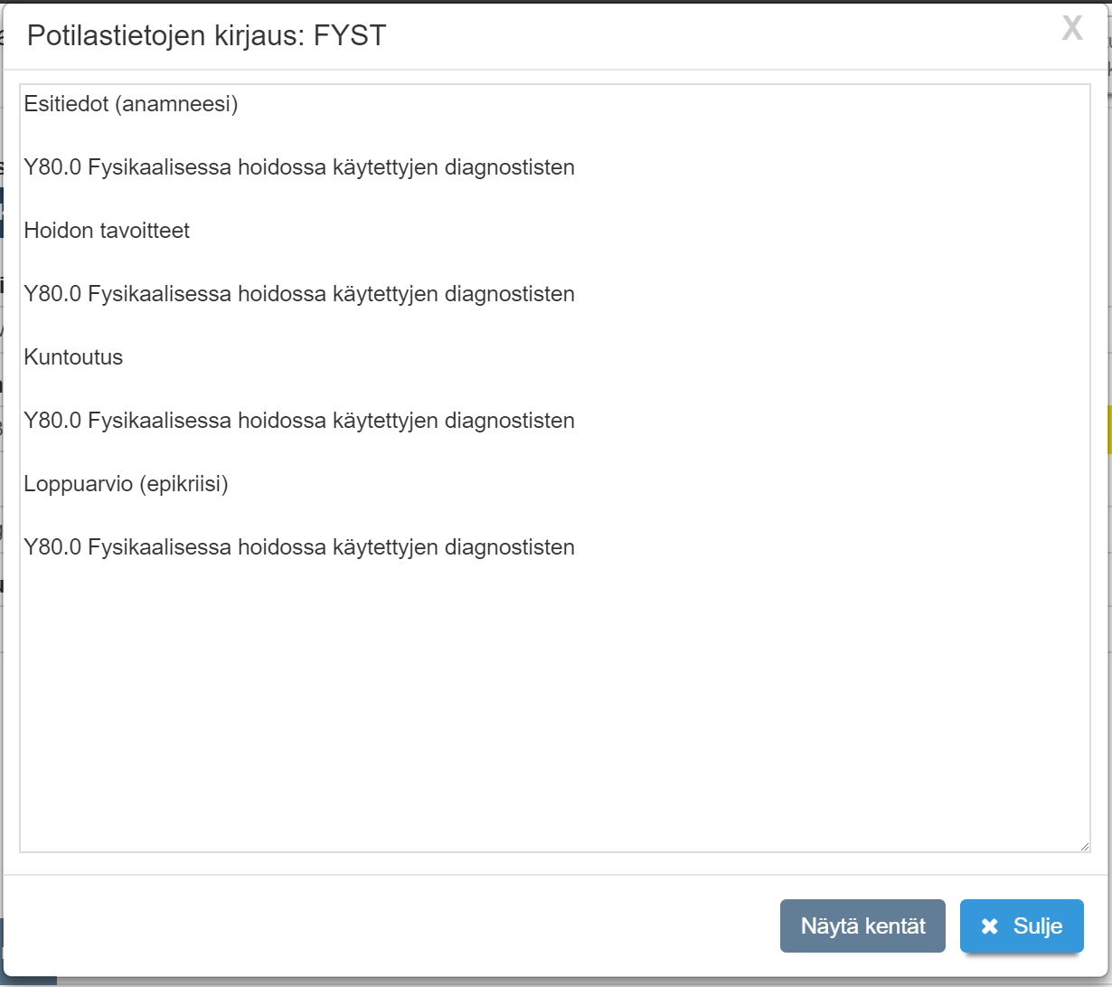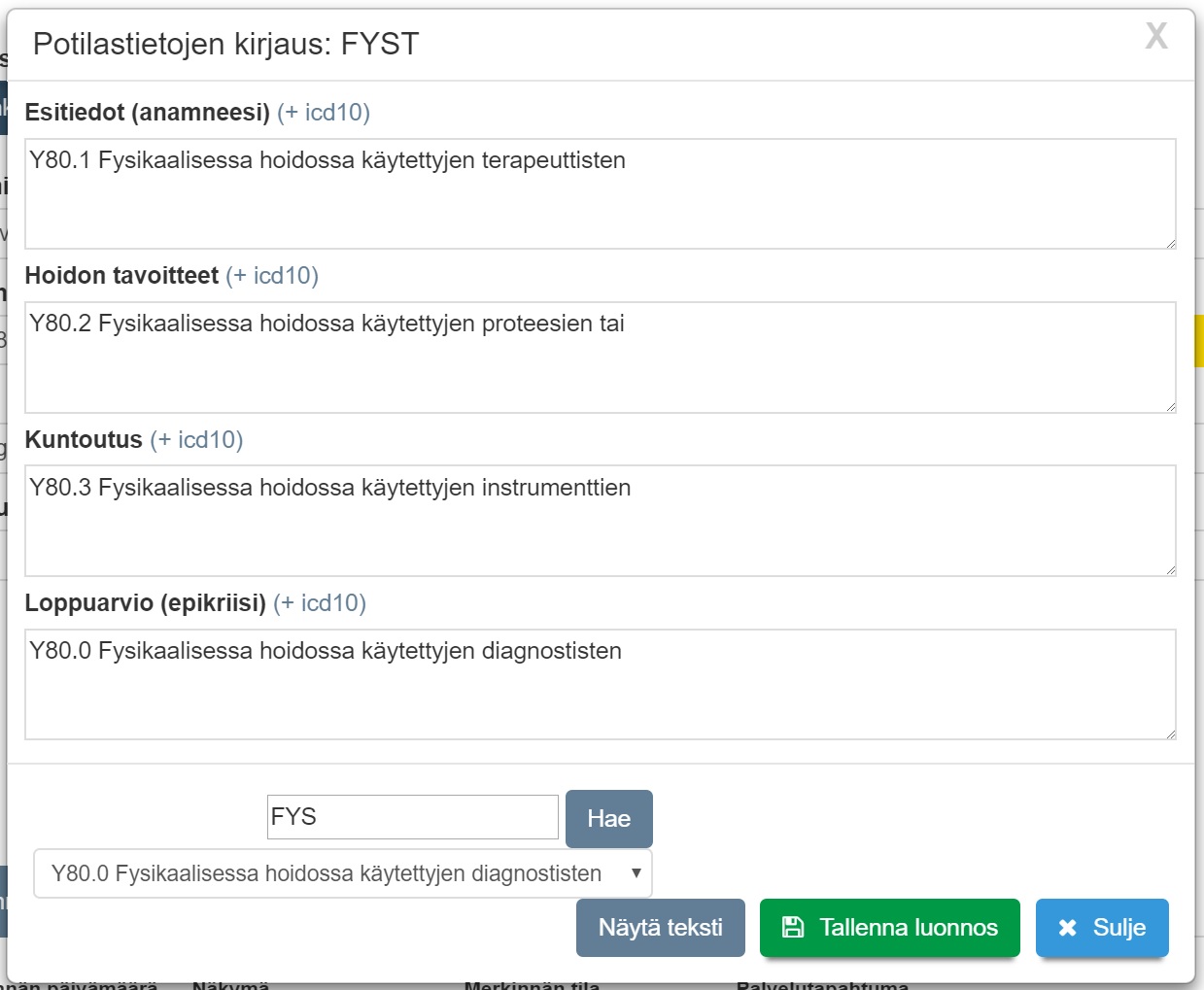 Potilastietomerkintöihin saa lisättyä ICD10-listauksesta koodeja.