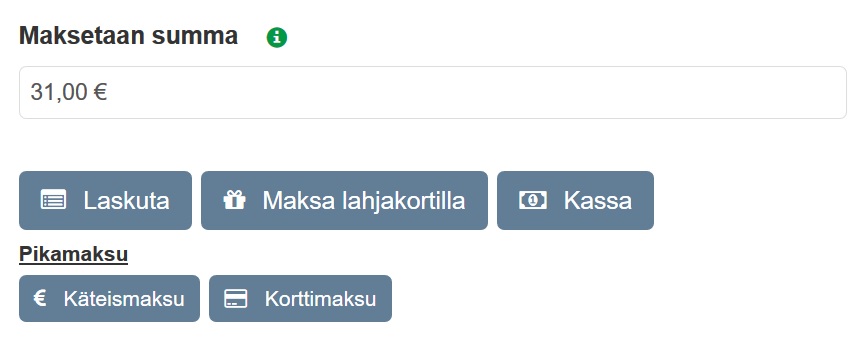Pikamaksamisen avulla voidaan suoraan suorittaa korttimaksu integroidun oletusmaksupäätteen avulla. Myös käteismaksu voidaan kirjata pikamerkintänä suoraan valitulle summalle ilman välivaiheita.
