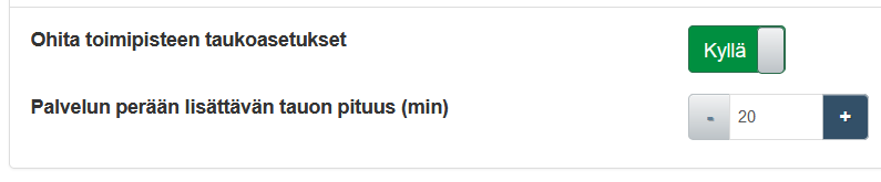 Meiltä on paljon pyydetty ominaisuutta, jolla palvelun perään lisättävän tauon mitta olisi asetettavasti henkilökohtaisesti, kun tähän asti valinta on ollut mahdollinen vain toimipistetasolla. Olemme kuunnelleet asiakkaitamme ja lisänneet tällaisen ominaisuuden.