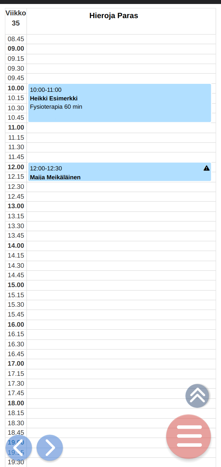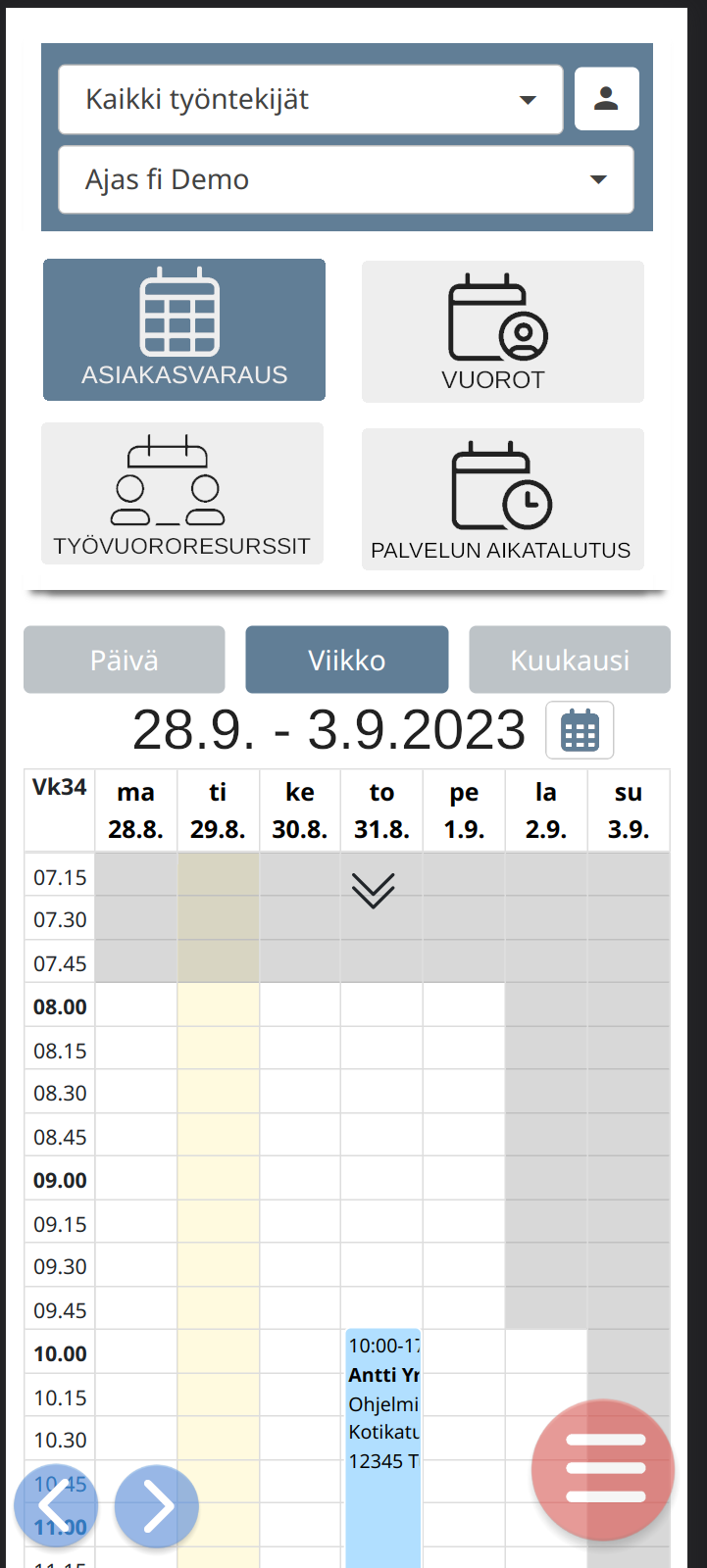 Sisältää selkeät ja suuret ylävalikot mobiililaitteelle. Niiden välillä onnistuu vaihtaa helposti ajanvarauksen, työvuorojen, resurssivarauksen ja palveluiden aikataulutetun hinnoittelun välillä.