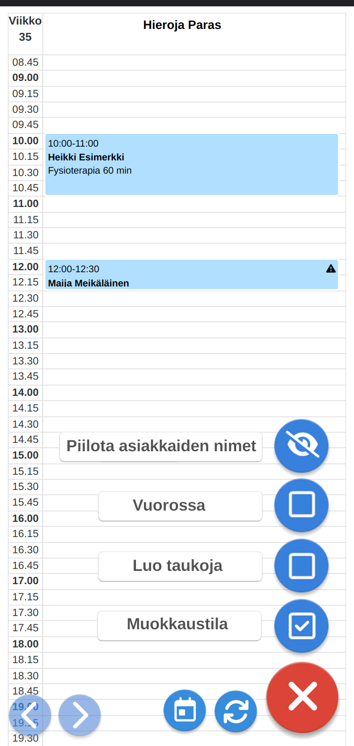 Pikavalikosta löytyy päivän tai viikon vaihto, näkymästä riippuen. Lisäksi siellä on uudelleenlataus, päivän valintakalenteri, taukojen asettaminen ja asiakkaan nimien piilottaminen.