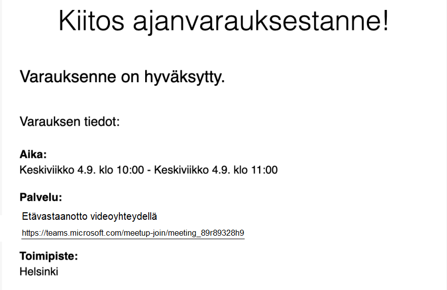 Ajas potilastietojärjestelmä sai uuden ominaisuuden, jonka avulla varausvahvistukseen voi luoda linkin etävastaanotolle tai videoneuvottelulle automaattisesti. Videoneuvottelulinkki voidaan esittää varausvanvistuksessa esimerkiksi seuraavanlaiselta.