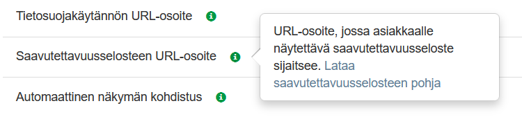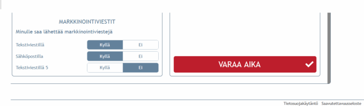 - Järjestelmän alaosaan on lisätty mahdollisuus esittää Saavutettavuusseloste -linkki, josta saa ladattua saavutettavuusdirektiivin edellyttämän saavutettavuusdokumentin. Dokumentti on organisaatiokohtainen ja yrityksen täytyy ladata itse se kohdasta Asetukset -> Nettivarauksen käyttäytyminen > Edistyneet asetukset -otsikko -> Saavutettavuusselosteen URL-osoite. Lataa siis saavutettavuusselosteen pohja, täydennä se yritystäsi koskien valmiiksi ja lataa esimerkiksi nettisivuillesi. Sen jälkeen lisää selosteen linkki asetuksiin ja olet toteuttanut saavutettavuusdirektiivin vaatimukset.