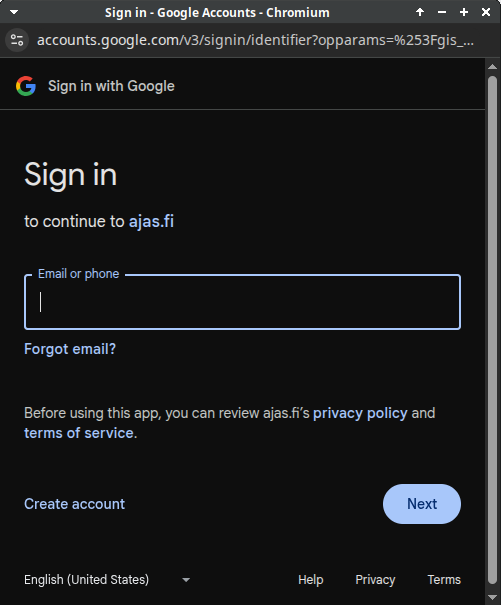 Aloita kirjautuminen Google-tilillä painamalla ”Kirjaudu Google-tilillä” painiketta. Selain avaa uuden ikkunan johon voit syöttää Google-tilisi tunnukset:
